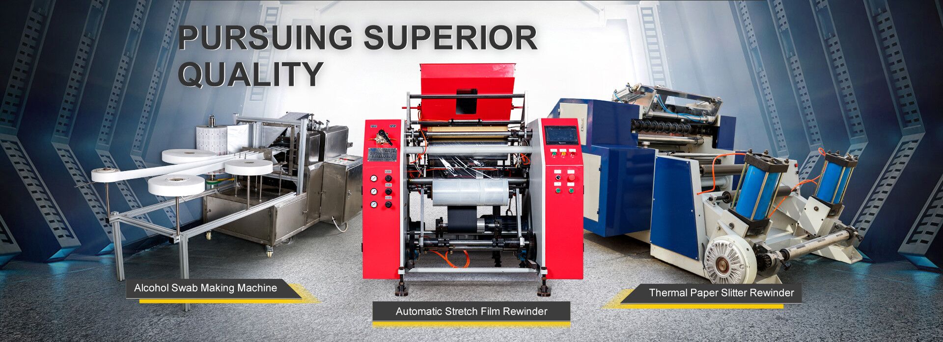 включает в себя машины для производства стретч-пленки, машины для пленочной ленты, машины для алюминиевой фольги, машины для спиртовых подушек, машины для тампонажных салфеток, машины для резки рулонов бумаги и многое другое.